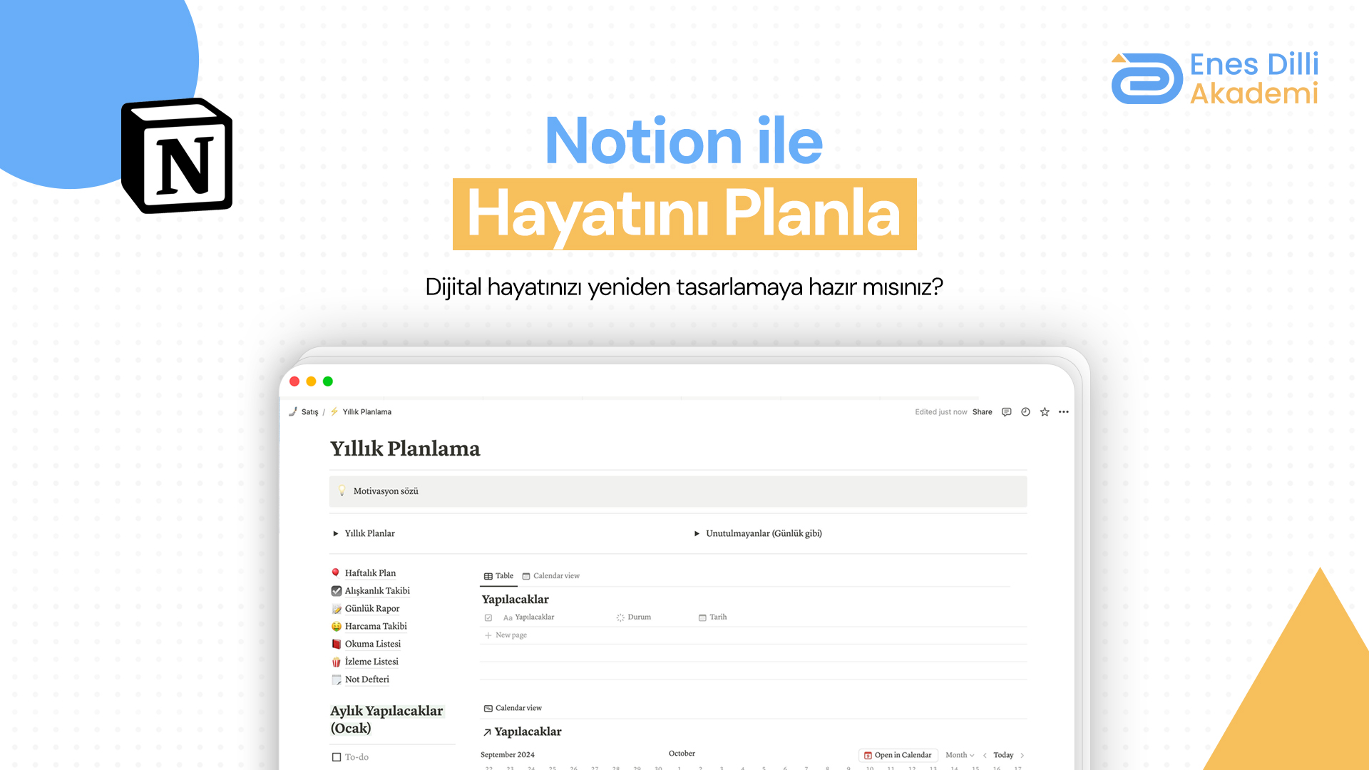 Tüm yaşam alanlarını tek ekranda yönetmeyi öğren; Notion ile takvim, hedef, alışkanlık ve projelerini tek merkezden organize et.